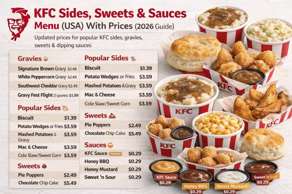 Looking for the latest KFC sides and sauce prices in the USA? This guide covers the most popular KFC sides (biscuits, fries, mac & cheese, mashed potatoes), gravies, desserts, and dipping sauces, plus tips on what pairs best with tenders, fried chicken, and bowls.